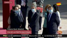La anécdota ha estado también en el saludo del rey Felipe VI a las autoridades asistentes. Nada de manos, por supuesto, ni de contacto alguno: inclinaciones de cabeza y manos al corazón, que es lo que imponen estos tiempos de Covid-19. Ya empieza a ser costumbre, pero no es lo mismo verlo en un acto pequeño, que en la Fiesta Nacional, donde el reguero de manos estrechadas era un ritual clásico.