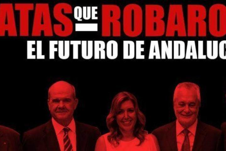 En otro montaje, igualmente impactante, en rojo y negro, con Díaz, Chaves y Griñán como protagonistas, el mensaje acusador va más allá: "Mientras tú sigues parado, ellos se gastaron tu dinero en drogas y puticlubs".
