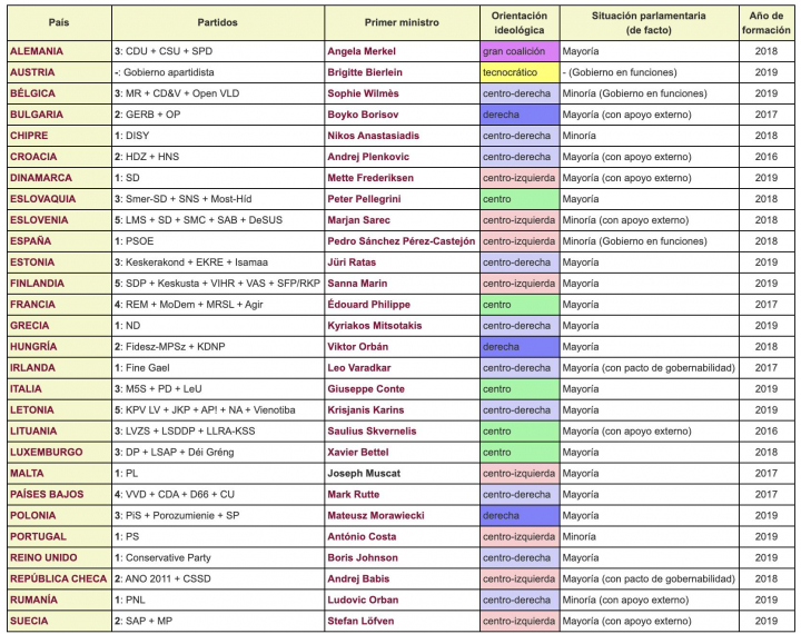 En este cuadro-resumen elaborado por el Barcelona Centre for International Affairs (CIDOB) se puede repasar en un golpe de vista cómo están las cosas en la UE, frente a la anomalía española, donde los pactos siguen sin llegar.