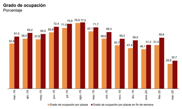 El grado de ocupación en el mes de marzo se quedó en un 28,9% de las plazas ofertadas, lo que supone un descenso anual del 45,3%. La ocupación ascendió al 32,7% durante los fines de semana, una reducción del 46,4% respecto al año anterior.