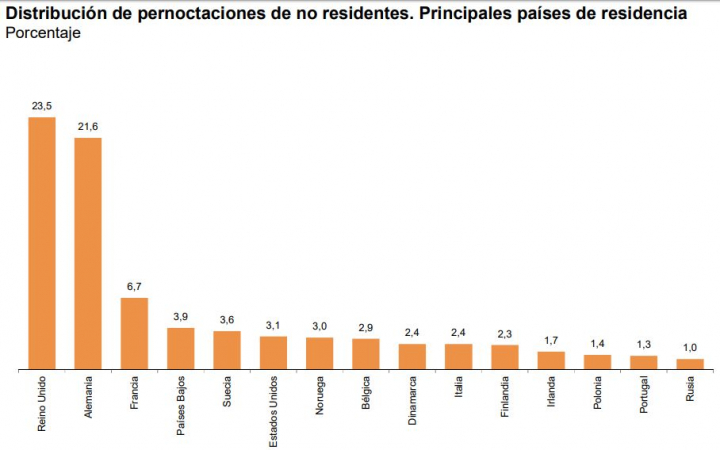 Según la nacionalidad, los viajeros procedentes de Reino Unido y Alemania fueron los principales clientes de los hoteles españoles, al concentrar el 23,5% y el 21,6% del total de pernoctaciones de no residentes, respectivamente. Eso sí, sus estancias cayeron más de un 50% respecto a 2019.