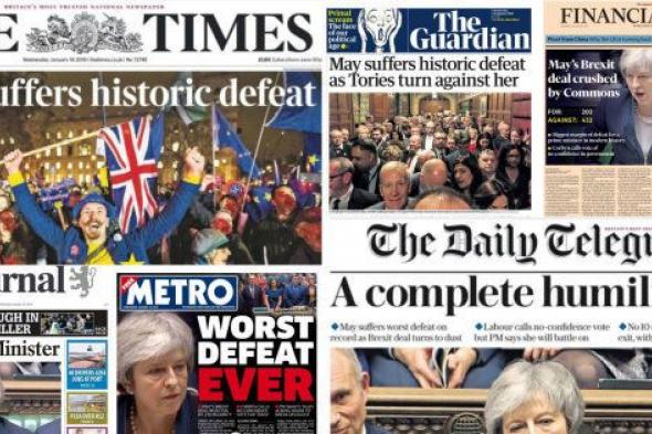 "Aplastante", "humillante", "caótica", "histórica"... Los calificativos se acumulan en las portadas de la prensa europea hoy para describir el batacazo que anoche se pegó la primera ministra de Reino Unido, Theresa May, en su parlamento, donde sus señorías dijeron no al acuerdo de divorcio con la Unión Europea, el renombrado como Brexit.