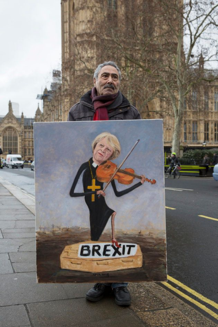 En la calle, un hombre se pasea a las puertas del Palacio de Westminster con un cuadro en el que aparece la primera ministra, Theresa May, enterrando un ataúd en el que pone "Brexit".