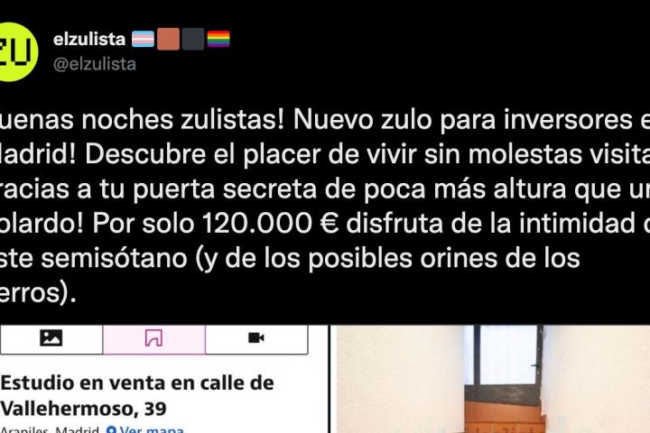 La cuenta de Twitter @elzulista ha publicado un anuncio que ha despertado la indignación de los usuarios en las redes sociales. “Buenas noches zulistas! Nuevo zulo para inversores en Madrid! Descubre el placer de vivir sin molestas visitas gracias a tu puerta secreta de poca más altura que un bolardo!”, ha escrito.