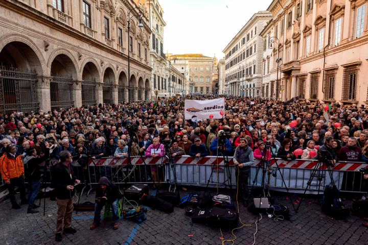 Las sardinas, que surgieron en Boloña precisamente para detener el avance de Salvini en las elecciones regionales de Emilia-Romagna, y que contribuyeron a la victoria de la izquierda, empezaron de este modo la “defensa” de la capital italiana.