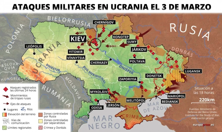 Mientras la vía diplomática intenta abrirse paso, sin demasiado éxito aún, continúan los bombardeos sobre la capital, que sigue bajo la amenaza de la llegada del gigantesco convoy militar que se situaría a cerca de 30 kilómetros de Kiev. También siguen los combates en las calles de Járkov, la segunda mayor ciudad del país, en el norte.