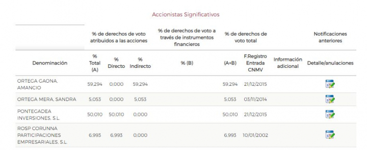 El multimillonario Amancio Ortega, fundador y expresidente del grupo textil, es el máximo accionista de Inditex, siendo propietario del 59% del grupo, tal y como se puede en la página web de la CNMV.