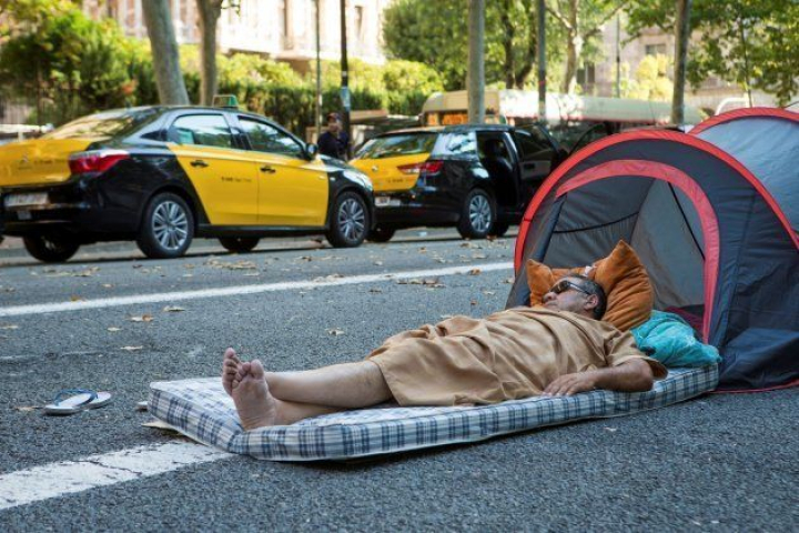 Los taxistas barceloneses que llevan en huelga desde la semana pasada, esperan acampados en la calle Gran Vía y el paseo de Grácia a que el Ministerio de Fomento tome cartas en el asunto de los vehículos de turismo con Conductor, VTC.