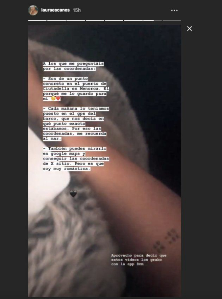 A través de Instagram Stories Escanes, de 22 años, ha señalado que son las coordenadas "de un punto concreto en el puerto de Ciutadella en Menorca". "El porqué me lo guardo para mi", ha añadido la mujer de Risto Mejide.