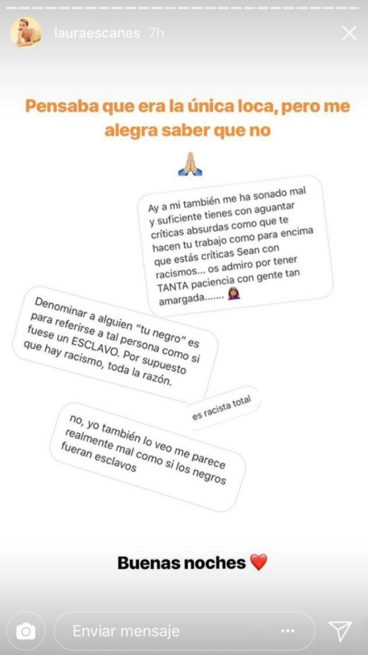 Poco después, Laura Escanes ha hablado de lo ocurrido a través Instagram Stories y ha asegurado que el comentario le ha sonado racista por lo de "negro".