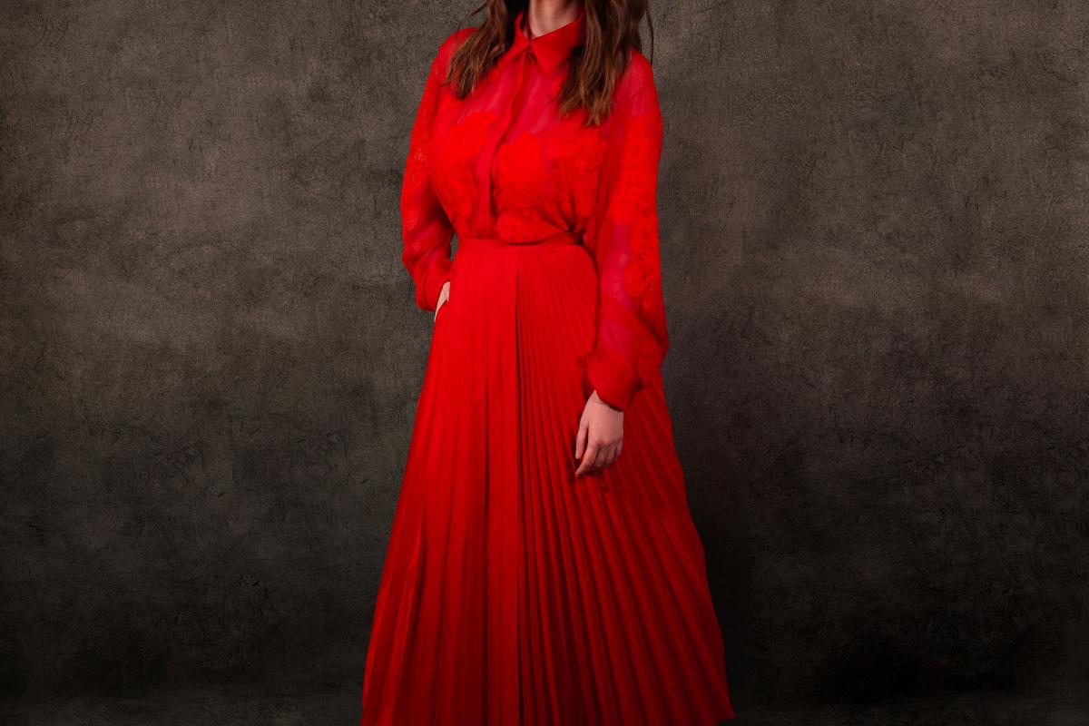 La italiana ha agradecido el premio desde su casa con un total look rojo de Valentino con una camisa con transparencias y bordados y una falda drapeada por encima de los tobillos.