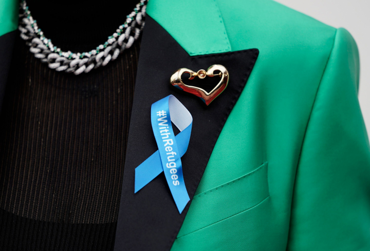 Lazo azul por los refugiados en la solapa de Diane Warren.Jae C. Hong / GTRES