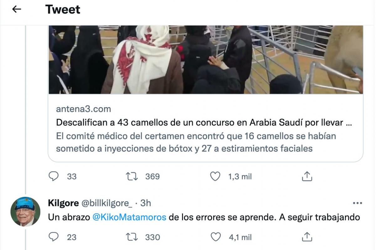 A este mensaje ha respondido el famoso tuitero Bill Kilgore citando al televisivo y diciendo: “Un abrazo Kiko Matamoros, de los errores se aprende. A seguir trabajando”.