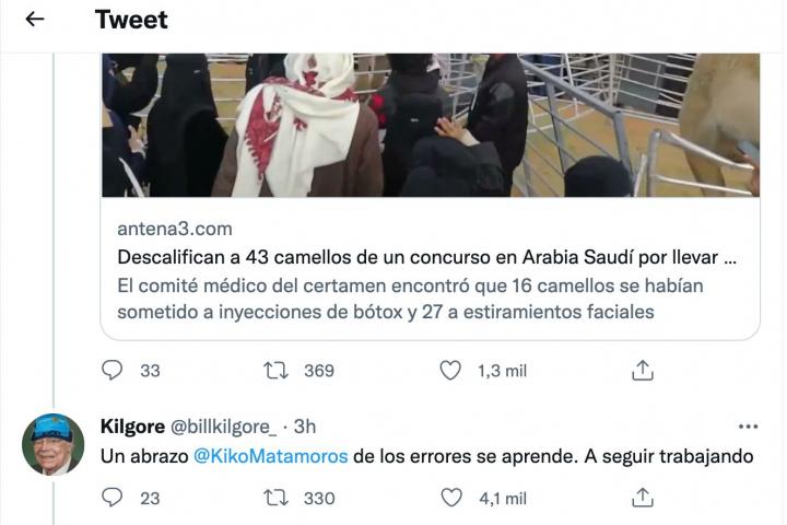 Kiko Matamoros ha logrado repercusión en Twitter con su respuesta a la broma de un conocido tuitero. El colaborador de Sálvame ha sido citado en una noticia relacionada con un concurso de belleza de camellos.