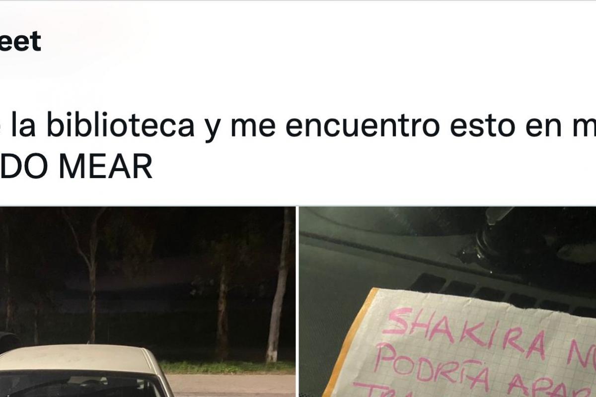 “Shakira nunca podrá aparcar tranquila en un descampado. No llores por no ser un Ferrari”, reza escrito en mayúsculas y en rsa fosforito en el folio a cuadros que han dejado en su coche.