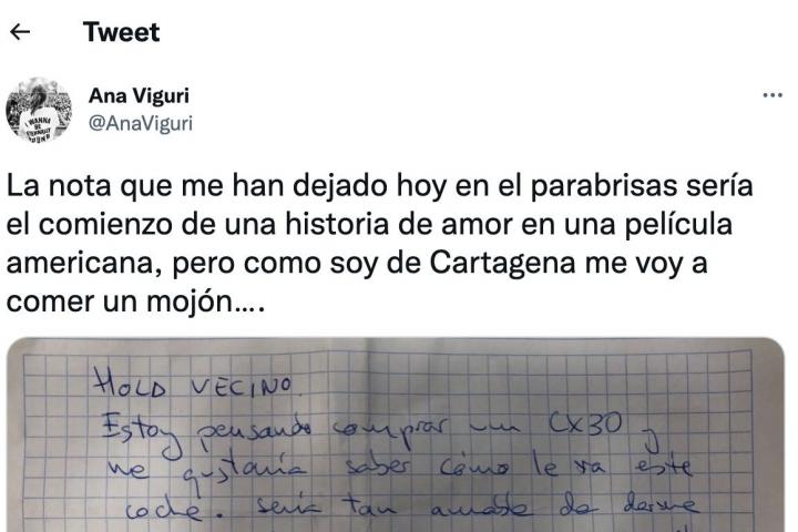 La tuitera no se lo ha podido tomar mejor y ha escrito en tono de humor: “La nota que me han dejado hoy en el parabrisas sería el comienzo de una historia de amor en una película americana, pero como soy de Cartagena me voy a comer un mojón….”.