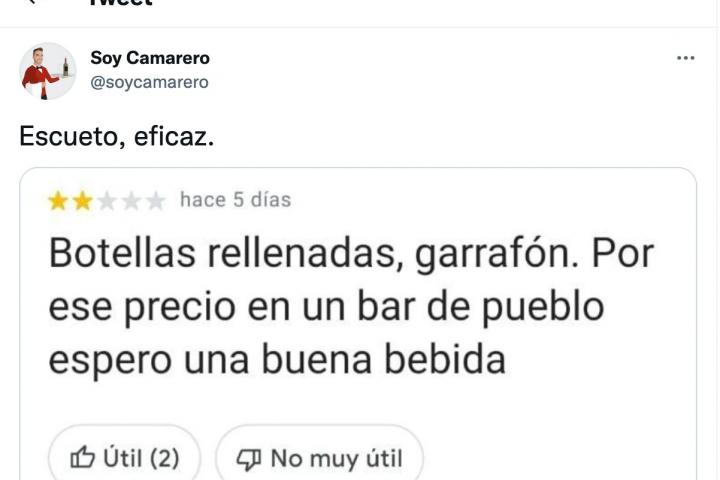 En esta reseña, el usuario le da al establecimiento dos estrellas y acusa al dueño de dar bebida de mala calidad y venderla como buena: “Botellas rellenadas, garrafón. Por ese precio en un bar de pueblo espero una buena bebida”.