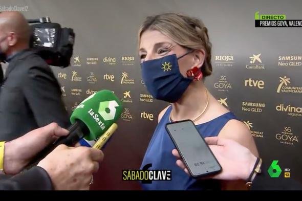 La ministra Trabajo ha pasado por la alfombra roja y le han preguntado directamente si “le recuerda algo una sala llena de gente esperando a votar” en referencia a la votación de la reforma laboral de hace unas semanas.