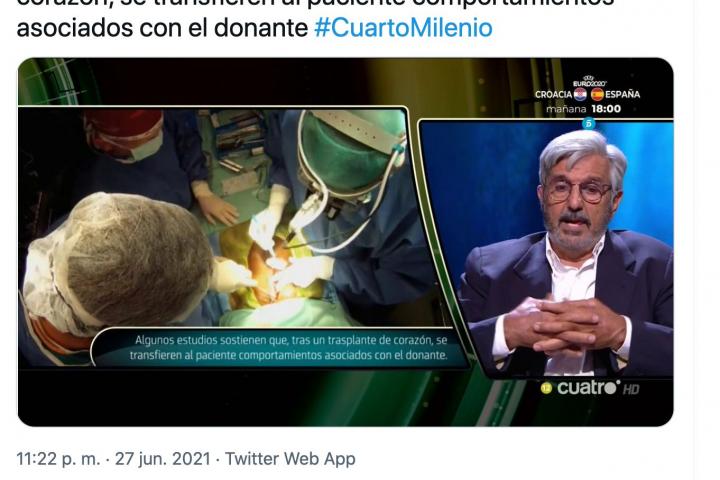 Por otro lado, la periodista de RTVE, Ana Ruiz Echauri, ha sido mucho más crítica y ha afirmado citando el tuit del presentador de Cuarto Milenio: “Somos líderes mundiales en donación de órganos, es decir, en salvar vidas con gran generosidad. El daño que hacéis con estas idioteces es incalculable. No tenéis la mínima ética exigible no ya a un programa, sino a un ser humano. Sinvergüenzas”.