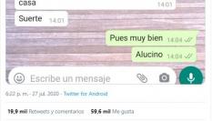 Sus cuatro mensajes a un simple cómo estás han hecho historia en Twitter y la publicación con el pantallazo de la conversación ya acumula más de 24.000 compartidos y 160.000 me gusta.