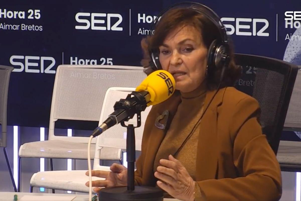La exvicepresidenta del Gobierno Carmen Calvo ha participado, como cada lunes, en El Ágora de Hora 25 de la Cadena SER, en el que debate con el también exvicepresidente del Gobierno Pablo Iglesias y el eurodiputado del PP y ministro de Exteriores con Rajoy, José Manuel García Margallo.