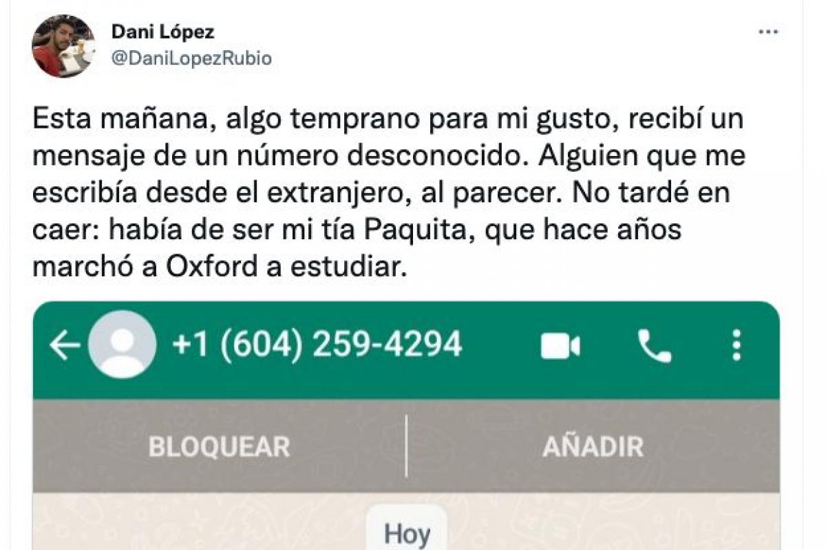 “Esta mañana, algo temprano para mi gusto, recibí un mensaje de un número desconocido. Alguien que me escribía desde el extranjero, al parecer. No tardé en caer: había de ser mi tía Paquita, que hace años marchó a Oxford a estudiar”, escribió el joven, junto a las capturas de pantalla.