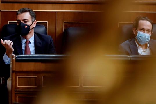 El presidente del Gobierno, Pedro Sánchez, aplaudido por el vicepresidente segundo, Pablo Iglesias y sus compañeros de partido tras su intervención.