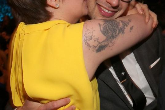 Designer Rachel Antonoff poses with her brother Jack Antonoff and Lena Dunham at the Rachel Antonoff Spring 2013 presentation at the Drive In Studios on Sept. 8, 2012, in New York City.
