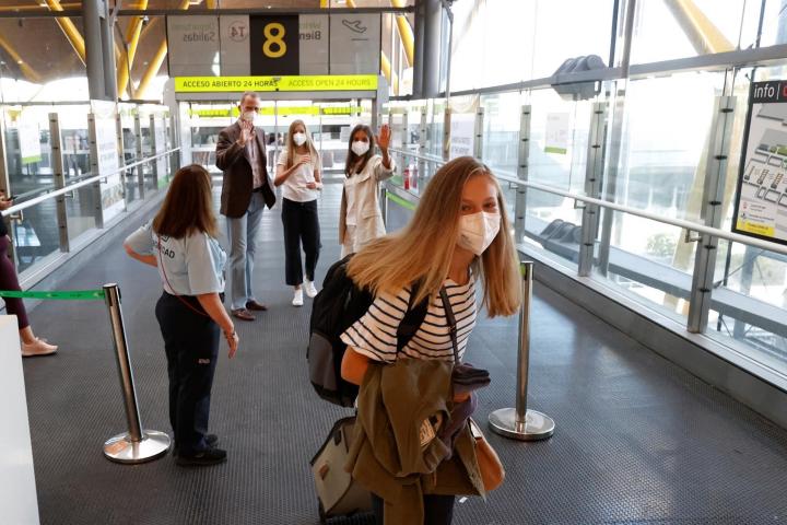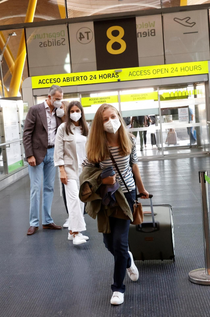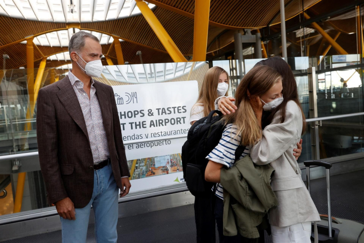 La familia real ha despedido a la heredera en las puertas de la Terminal 4, ante la imposibilidad de acceder al interior por el protocolo covid. Allí se han despedido entre abrazos, como se puede comprobar en las imágenes que han sido distribuidas por EFE y Casa Real.