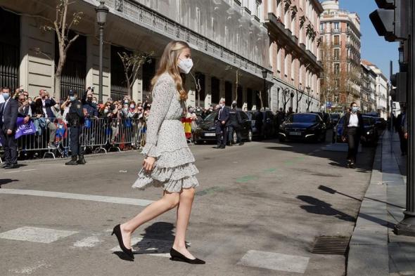 Lo único que ha cambiado en esta intervención es el peinado. Leonor ha cambiado la trenza que llevó en Asturias y ha optado por dejar su melena suelta y ligeramente ondulada.