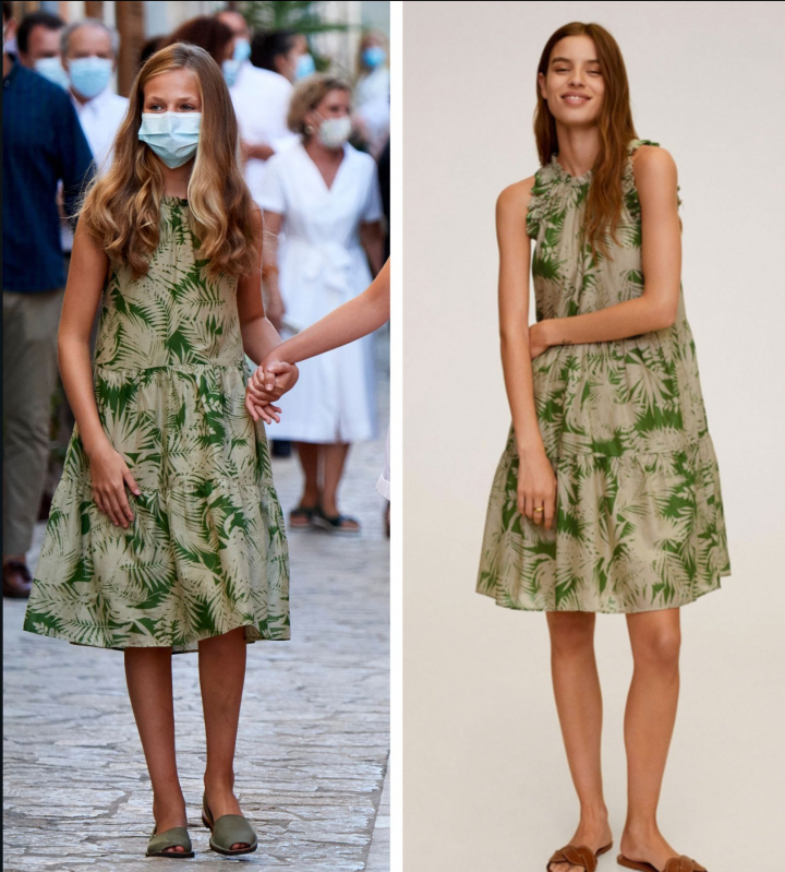 Esta vez el estampado del vestido verde de la princesa Leonor ha sido tropical, con enormes en tono beige en lugar de flores. Pertenece a la nueva colección de Mango y se vende por 39,95 euros.
