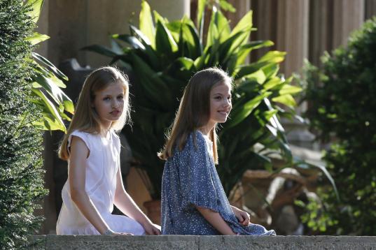 La reina Letizia, de espaldas, con sus hijas Leonor y Sofía en el posado de verano en el palacio de Marivent, en Palma de Mallorca.