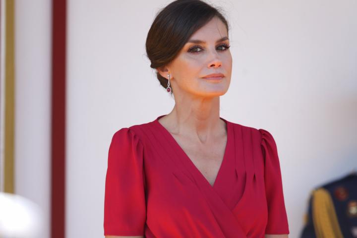Letizia ha ganado la apuesta con un vestido midi drapeado con escote cruzado, abotonado en la cintura y con mangas abullonadas. En cuanto al calzado, la reina ha elegido unos zapatos rojos con tacón ancho y alto y un bolso de mano de ante, también en rojo.