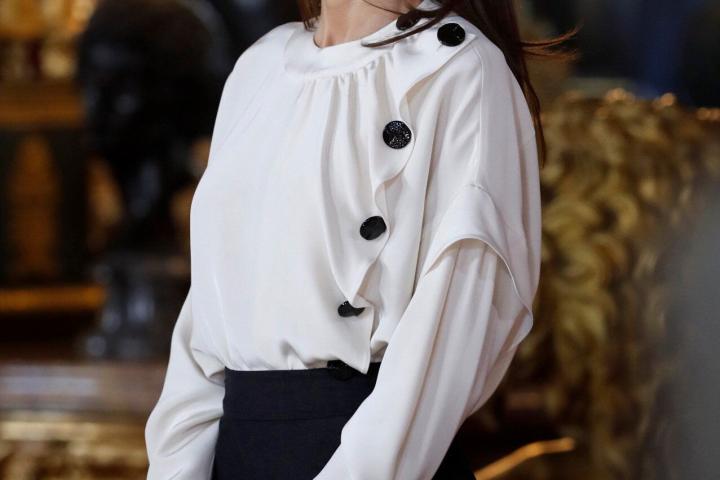 Se trata de un blusón blanco de seda con grandes botones negros a modo decorativo y está agotada. Costaba 154 euros. Es la primera vez que Letizia incluye a esta marca en su armario, pero no es la primera vez que las prendas de Maksu salen del vestidor de Zarzuela.
