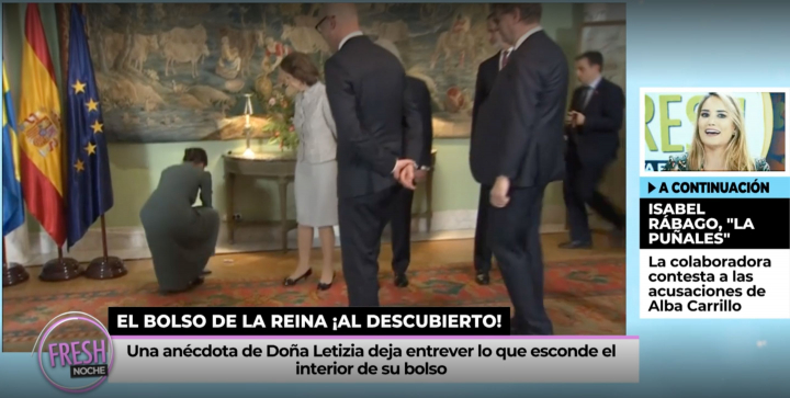 El complemento, diseñado por Lidia Faro, cayó al suelo y de él salieron varios objetos. Letizia se apresuró a recogerlos, a pesar de que hasta cuatro miembros de su equipo se acercaron a hacerlo.