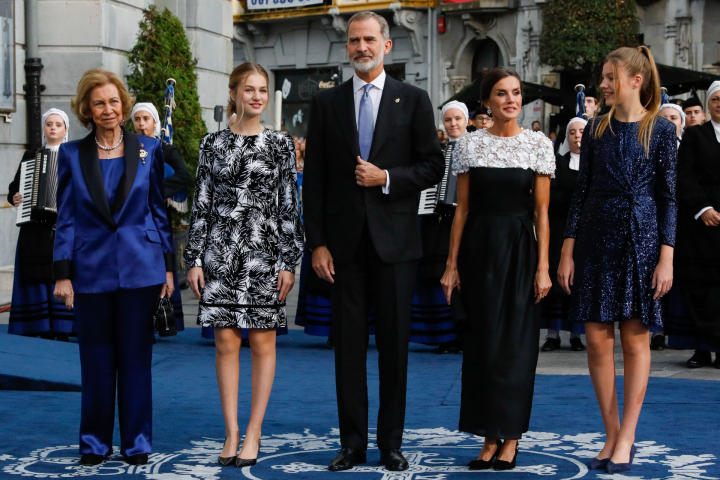 Para sus primeros Princesa de Asturias como reina, Letizia lució un vestido lápiz en tono azul con encaje de maya negro.