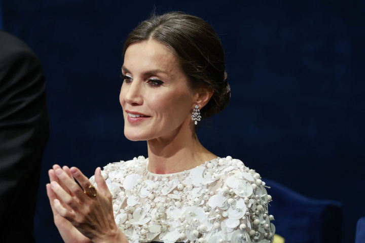 Letizia se soltó la melena con un Felipe Varela con pedrería y chaqueta blanca a juego.