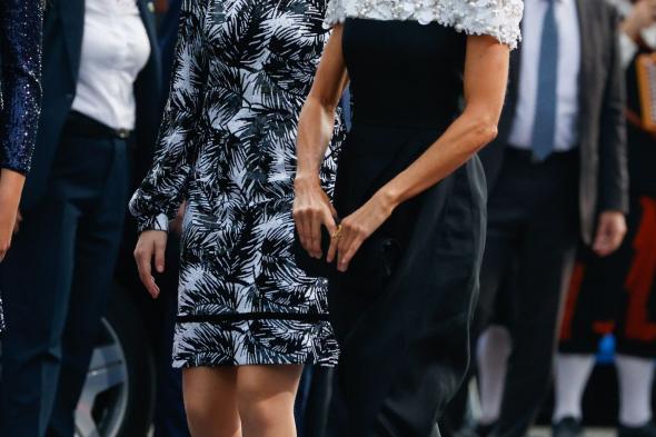 La consorte no ha querido hacer un gran despliegue de joyas y ha prescindido de pulseras. Sí ha llevado unos espectaculares pendientes de diamantes que ya lució en una cena de gala con el emir y la duquesa de Qatar ya que son un regalo personal de las autoridades del país. Tras esa velada, Casa Real confirmó a Vanitatis que los pendientes pasaban a formar parte de Patrimoio Nacional y que se usarían en ocasiones puntuales. Letizia también ha llevado el anillo de Karen Hallam del que no se despega.
