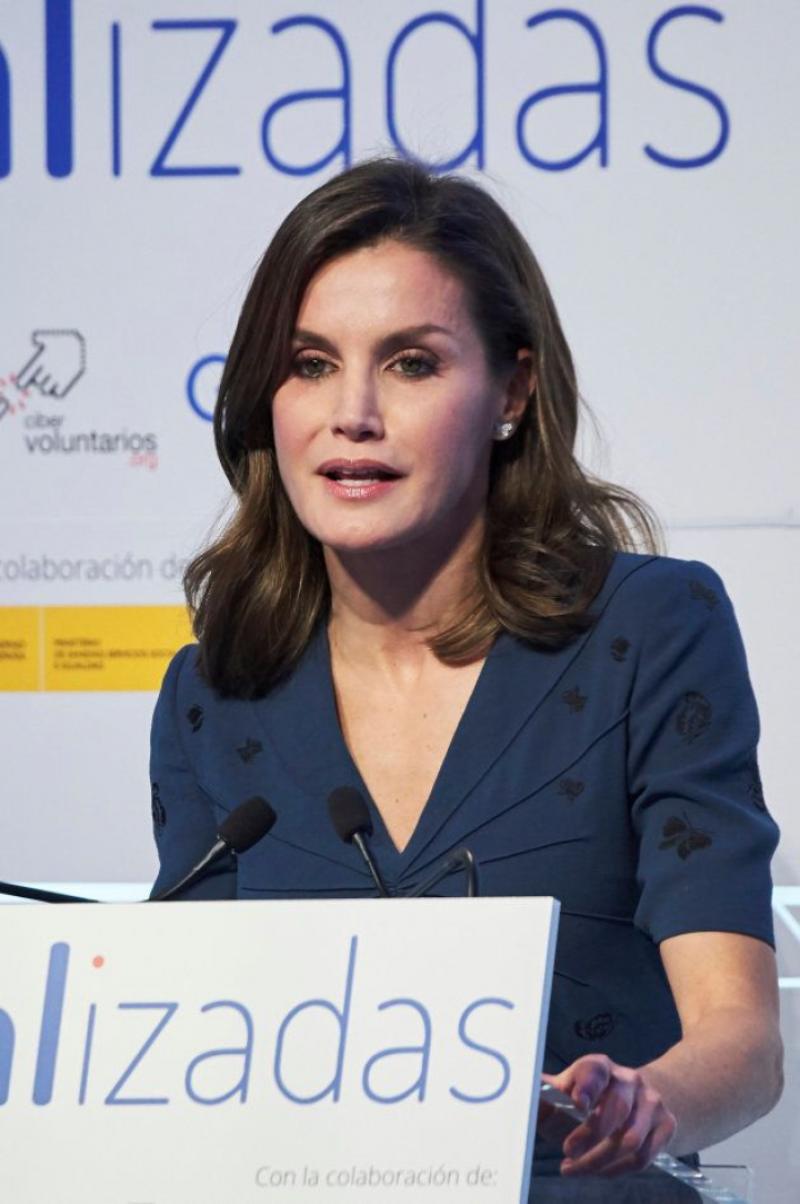 Letizia repitió sus habituales stilettos negros de Prada y eligió unos pendientes de Elena Carrera en forma de mariposa. La reina optó por dejar su melena suelta y un maquillaje natural para este acto.