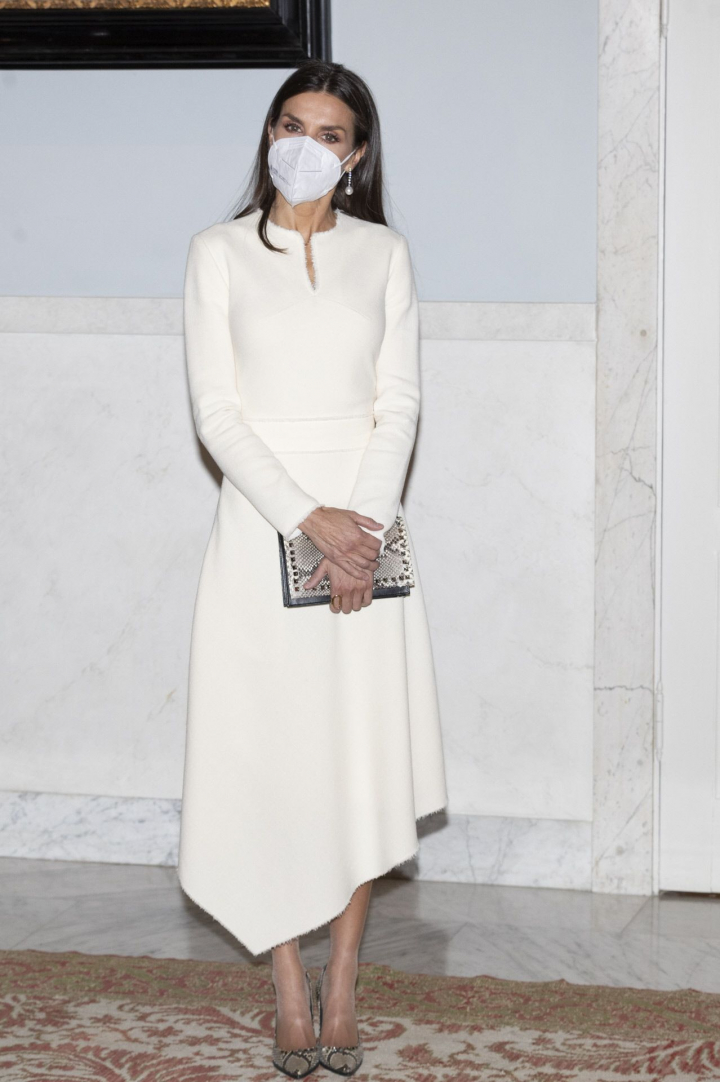 Como pieza principal del look, Letizia eligió un vestido blanco de bajo asimétrico que ha lucido en otras ocasiones y del que se desconoce la firma. Lo combinó con unos pendientes de perlas y diamantes, y zapatos y clutch en estampado animal print. Un conjunto que, para Vanitatis, es digno de una “reina de las nieves”.