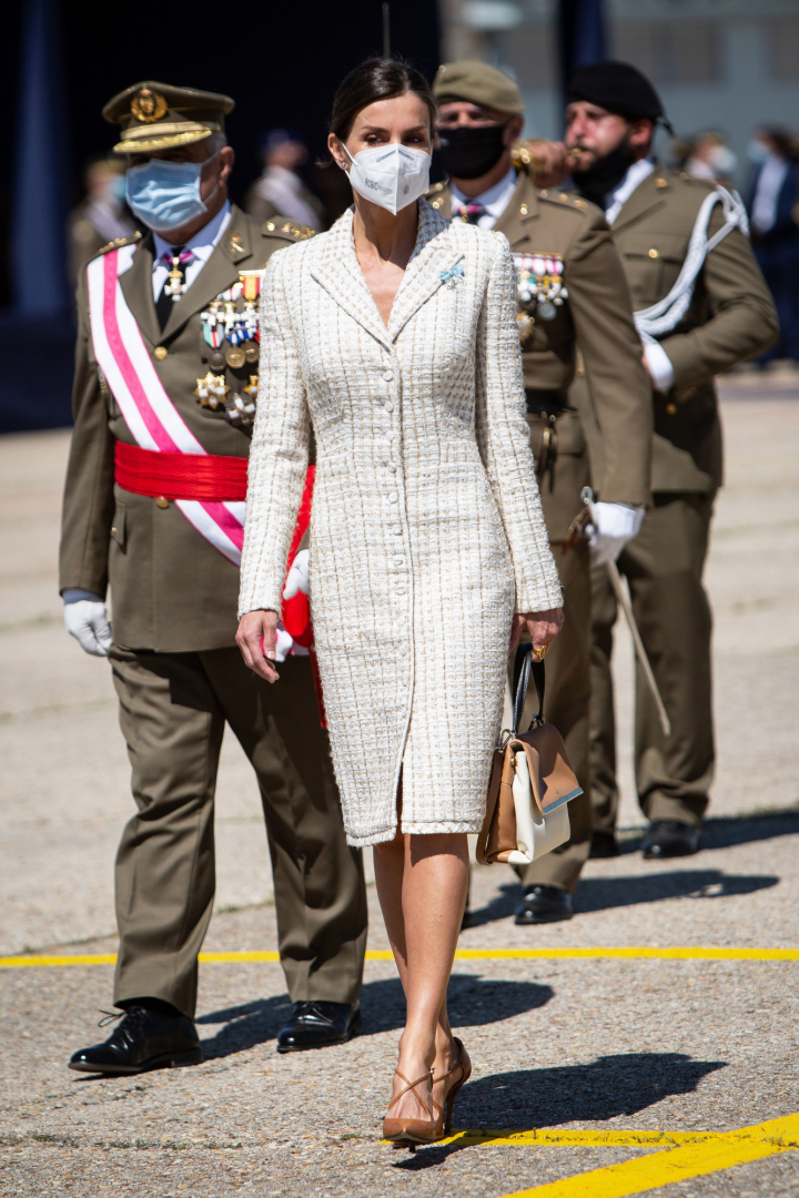 En mayo presidió un acto en la base militar de Colmenar Viejo (Madrid), donde recicló el vestido abrigo que llevó hace más de 15 años en el bautizo de Leonor. Todavía no había llegado el verano, pero las temperaturas ya rozaban los 30 grados y no había un árbol bajo el que refugiarse.