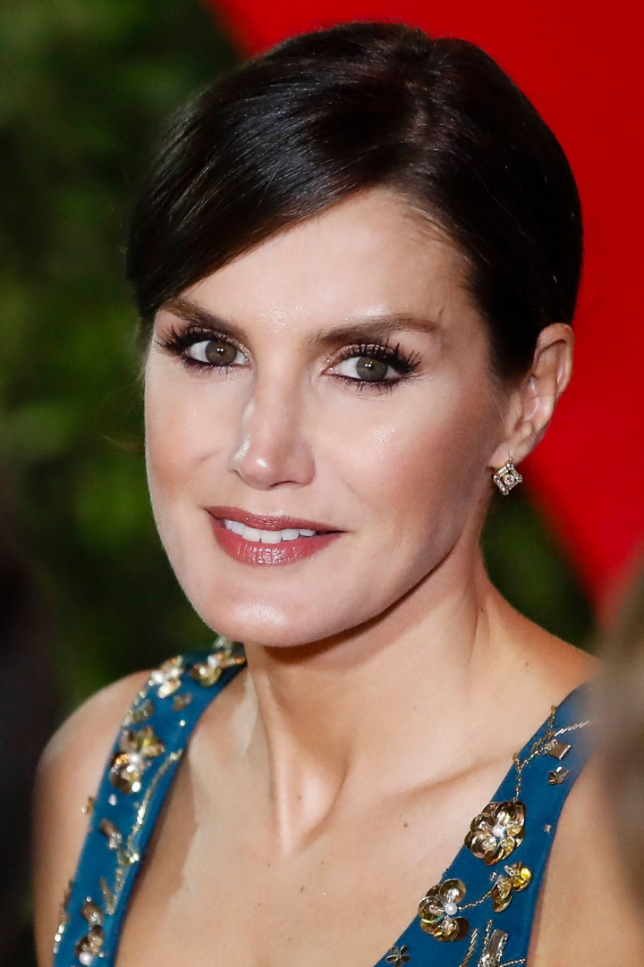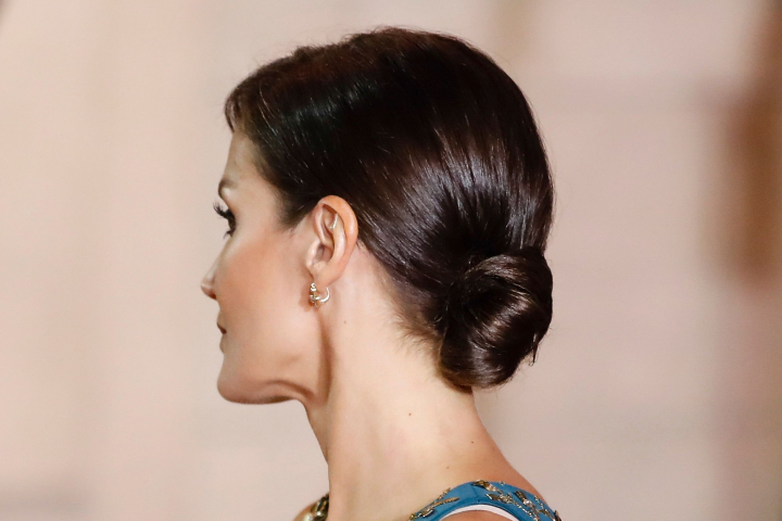 La reina completó su look con unos discretos pendientes de oro y brillantes. El recogido con raya al lado elegido para esta ocasión los dejaba al descubierto.