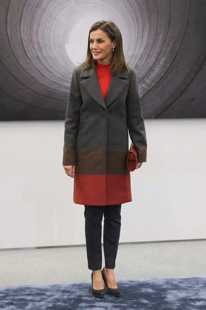 La reina Letizia ha vuelto a vestir este miércoles un abrigo abrigo rojo y gris de Hugos Boss que ha lucido en varias ocasiones este año.