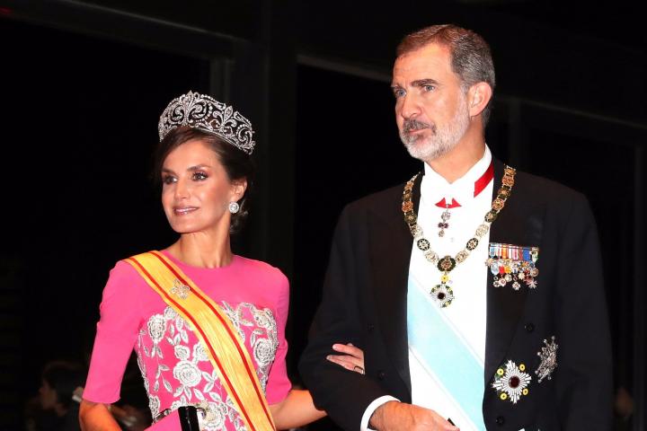 Tras apostar por el verde, el estampado de flores y un tocado para la ceremonia de entronización de Naruhito este martes en el Palacio Imperial de Tokio, en Japón, doña Letizia ha cambiado de registro para la cena de gala posterior.