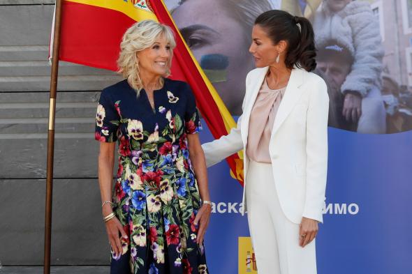 Doña Letizia ha sido la primera en llegar a las instalaciones, a cuyas puertas ha esperado unos momentos la llegada de Jill Biden, quien ha acudido a la cita acompañada de sus nietas Maisy y Finnegan.