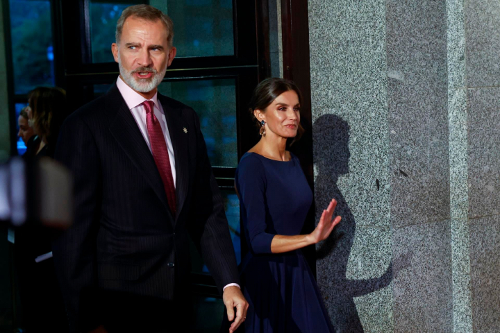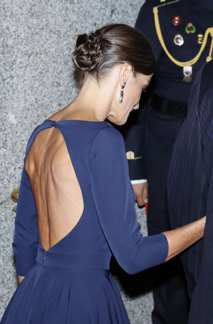 Es lo que ha sucedido en la noche del lunes, ya que Letizia ha llegado al teatro con un vestido azul marino que dejaba al aire prácticamente toda su espalda. La parte trasera de la prenda es la más arriesgada del diseño, de escote cerrado y con una gran falda asimétrica rematada en volante.