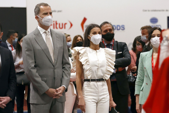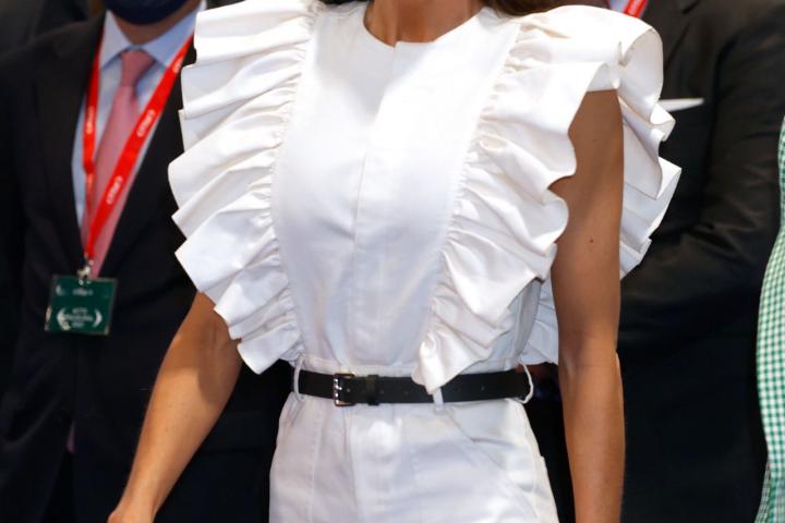 Es la primera vez que Letizia apuesta por esta marca, que nació a mediados de 2020 y que presentó en abril su tercera colección, a la que pertenece el mono con volantes elegido para inaugurar la feria de turismo más importante de España.