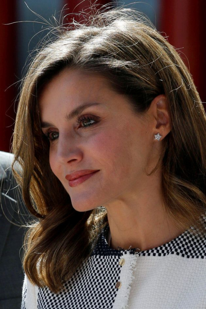 Para esa visita, celebrada sobre las 10 de la mañana, la reina Letizia optó por un pantalón de cuadros y una chaqueta —que no se le había visto antes— de cuadros blancos y negros y de un tejido grueso, diseñada por Hugo Boss. Como complementos se calzó unos zapatos negros de tacón ancho de Massimo Dutti de 70 euros, y usó los pendientes de estrellas de Chanel, que han estado entre sus favoritos durante años y que hacía un tiempo que no se ponía.