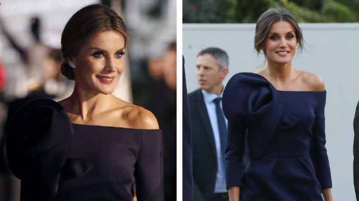 Por primera vez desde 2004 Letizia ha apostado por rescatar un diseño de su vestidor y por primera vez no ha confiado en Felipe Varela, el que fuera su diseñador de cabecera. La reina ha elegido un diseño azul marino de la firma española Delpozo que estrenó para la celebración del 50º aniversario del diario AS en diciembre de 2017. Un año después volvió a lucirlo en París para acudir a una retrospectiva de Joan Miró junto a Felipe VI y Emmanuel y Brigitte Macron.