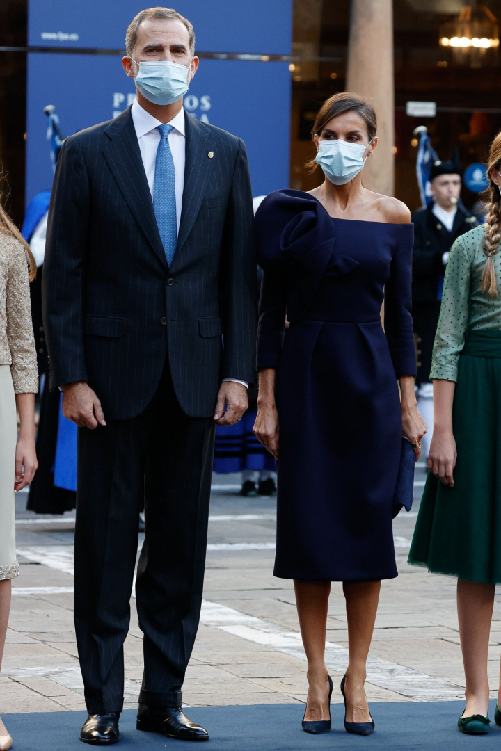 Para sus primeros Princesa de Asturias como reina, Letizia lució un vestido lápiz en tono azul con encaje de maya negro.